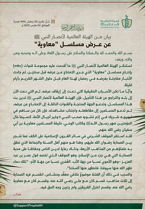 استنكرت الهيئة العالمية لأنصار النبي صلى الله عليه وسلم في بيان لها وأدانت عرض مسلسل “معاوية” في مجموعة قنوات (mbc).