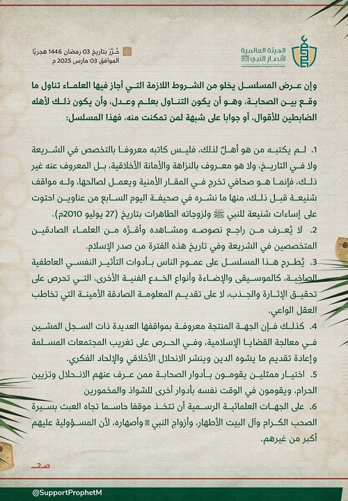 كما دعت المسلمين إلى مقاطعته واجتناب مشاهدته، فإن كل من أسهم في ترويجه شريك في إثم تشويه صحب النبي ﷺ وخير أجيال الأمة.