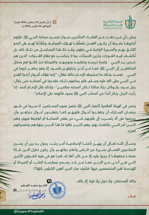 ونحن في الهيئة العالمية لأنصار النبي ﷺ ننصح عموم المسلمين، لا سيما في شهر رمضان المبارك، أن يتفقدوا أحوال قلوبهم كما يتفقدوا أحوال دنياهم، وأن يحرصوا على أن لا يتسرب إلى قلوبهم شيء من بغض الصحابة أو الوقيعة فيهم، وهم الذين أمر النبي ﷺ بالاقتداء بهم، وهم الذين نقلوا لنا هذا الدين بجهادهم وتضحياتهم الغراء.