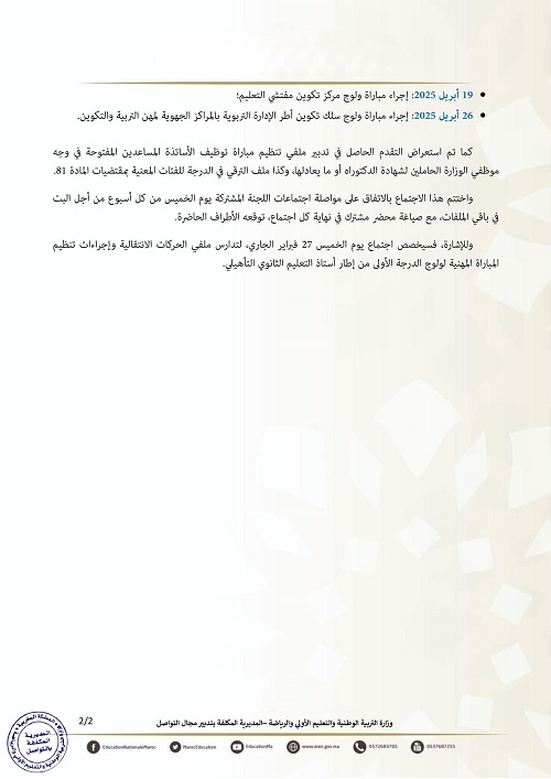 – 10 مارس 2025: بداية التكوين الخاص المرتبط بتفعيل مقتضيات المادة 76، المتعلقة بالإدماج في إطار مفتش في التوجيه التربوي بالنسبة لفئة المستشارين في التوجيه التربوي، ومفتش في التخطيط التربوي بالنسبة لفئة المستشارين في التخطيط التربوي، ومفتش الشؤون المالية بالنسبة لفئة الممونين؛