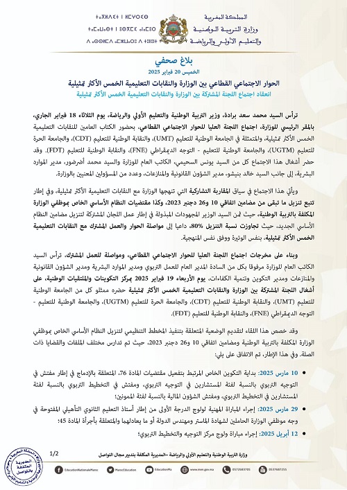 ▪️ انعقاد اجتماع اللجنة المشتركة بين الوزارة والنقابات التعليمية الخمس الأكثر تمثيلية.
