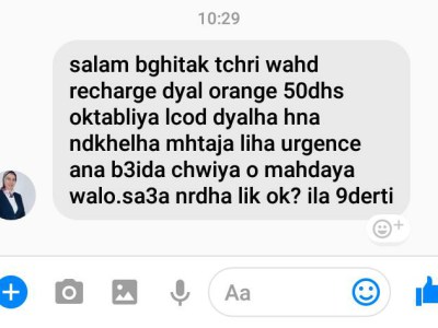 تفاجأ عدد من متصفحي مواقع التواصل الاجتماعي، خاصة أصدقاء نزهة الوافي، بتوصهم برسالة تطلب فيها الوزيرة المنتدبة المكلفة بالبيئة والتنمية المستدامة إرسالة تعبئة هاتف على وجه السرعة بقيمة 50 درهم، بدعوى أن الوزيرة ليس بقربها محل تجاري لتشتري منه التعبئة.