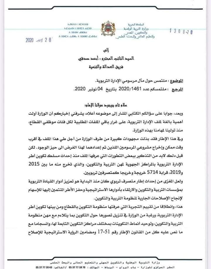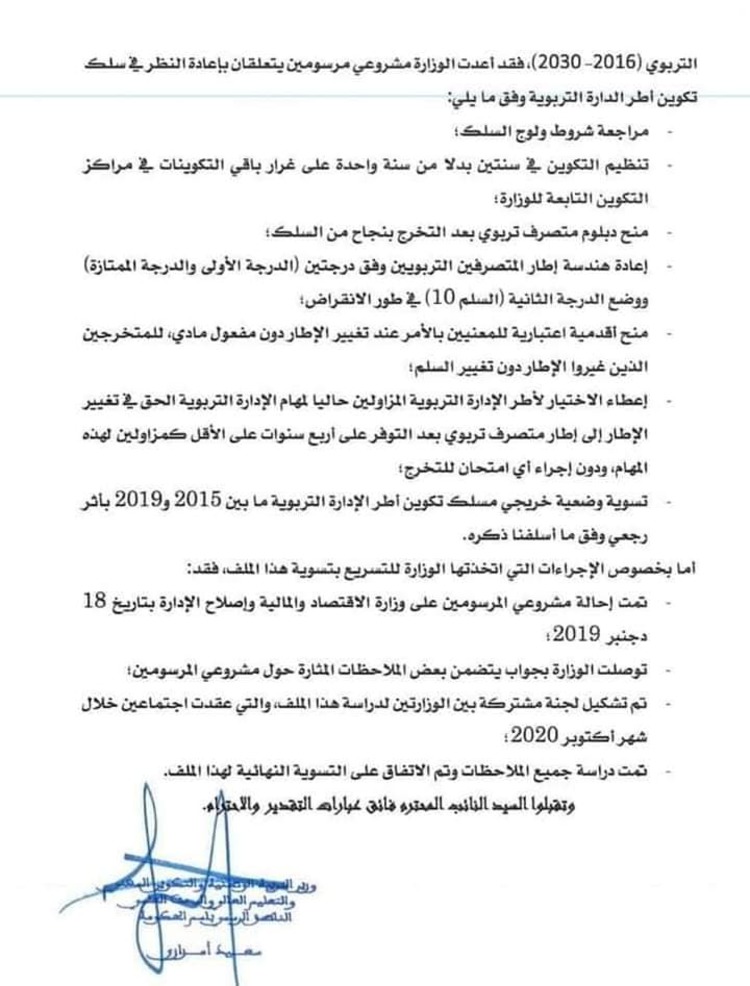 كما أكد الوزير، أنه سيتم تسوية وضعية خريجي مسلك تكوين أطر الإدارة التربوية ما بين 2015 و2019 بأثر رجعي، مشيرا إلى الإجراءات التي اتخذتها وزارته لتسريع تسوية هذا الملف، حيث تمت إحالة مشروعي المرسومين على وزارة الاقتصاد والمالية وإصلاح الإدارة بتاريخ 18 دجنبر 2019.