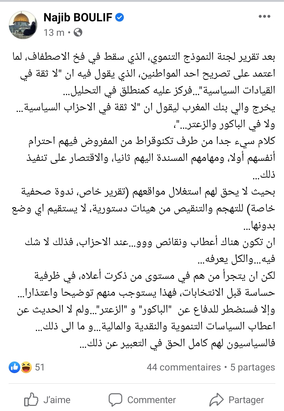 قال نجيب بوليف، الوزير السابق، والقيادي بحزب العدالة والتنمية، “بعد تقرير لجنة النموذج التنموي، الذي سقط في فخ الاصطفاف، لما اعتمد على تصريح أحد المواطنين، الذي يقول فيه إن “لا ثقة في القيادات السياسية”…فركز عليه كمنطلق في التحليل. يخرج والي بنك المغرب ليقول أن “لا ثقة في الاحزاب السياسية…ولا في الباكور والزعتر..” .