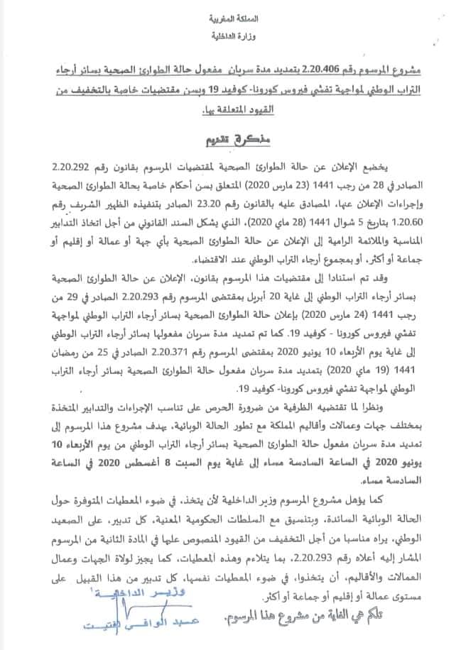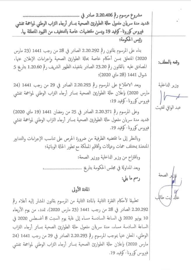 هذا، وستمدد حكومة سعد الدين العثماني حالة الطوارئ الصحية إلى غاية 8 غشت، وذلك وفق ما توصل به وزراء من حكومة سعد الدين العثماني، ضمن مشروع مرسوم تمديد حالة الطوارئ الصحية في سائر أرجاء التراب الوطني، بموجب المرسوم رقم 2.20.293 الصادر في 29 رجب 1441 الموافق لـ24 مارس 2020 بإعلان حالة الطوارئ الصحية بسائر أرجاء التراب الوطني لمواجهة تفشي فيروس كورونا المستجد “كوفيد 19”.