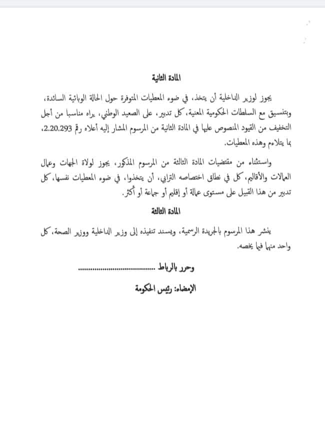 ضمن مشروع مرسوم 2.20.406 الذي ستصادق عليه اليوم الثلاثاء ضمن مجلس لها، وضعت الحكومة بين يدي الولاة والعمال تخفيف إجراءات الطوارئ.
