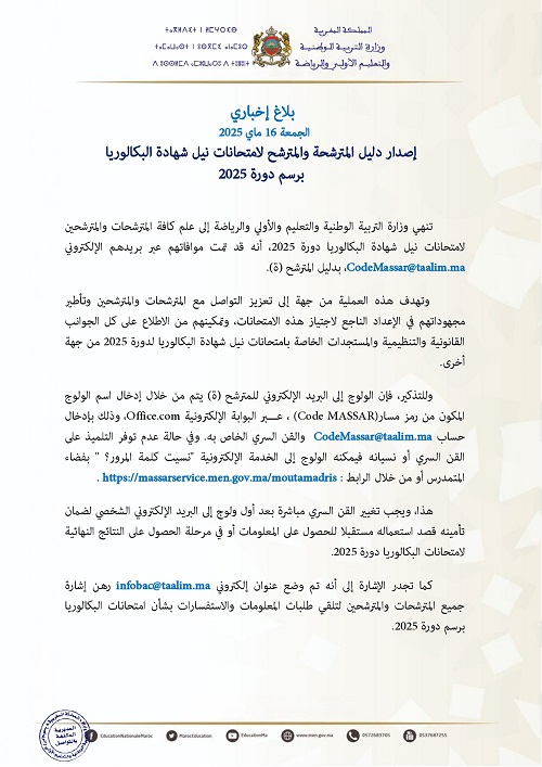وأفادت الوزارة، أنه يجب تغيير القن السري مباشرة بعد أول ولوج إلى البريد الإلكتروني الشخصي لضمان تأمينه، قصد استعماله مستقبلا للحصول على المعلومات أو في مرحلة الحصول على النتائج النهائية لامتحانات الباكلوريا دورة 2025.