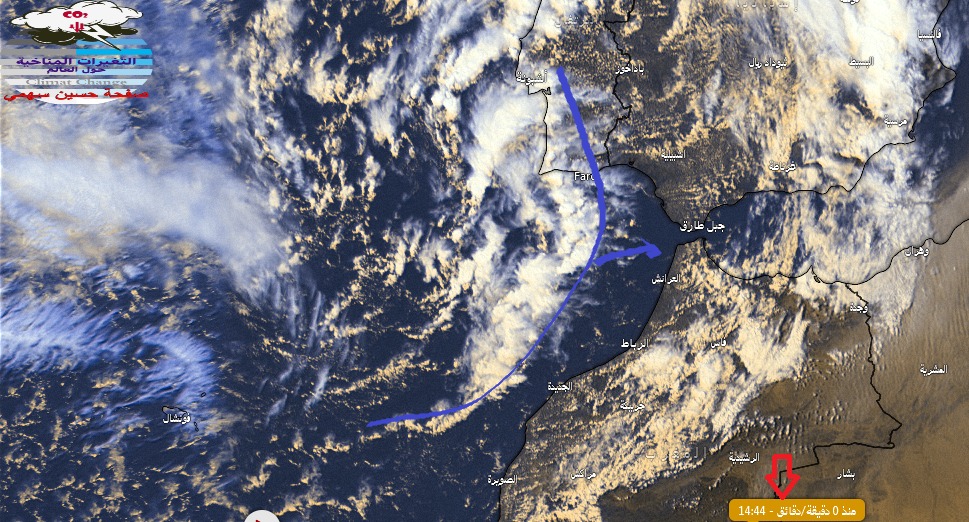 إلى وجود سحب كثيفة مصحوبة بأمطار غزيرة وعواصف رعدية تتجه شرقاً نحو الساحل الأطلسي لل”المغرب”.