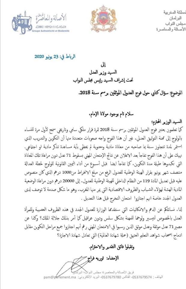هذا وقد وجهت النائبة البرلمانية عن حزب الأصالة والمعاصرة، ثرية فراج، سؤالا كتابيا إلى وزير العدل حول الموضوع جاء فيه: