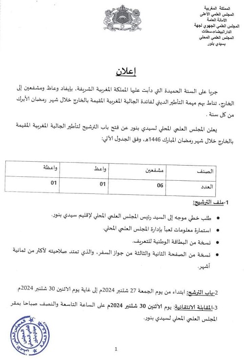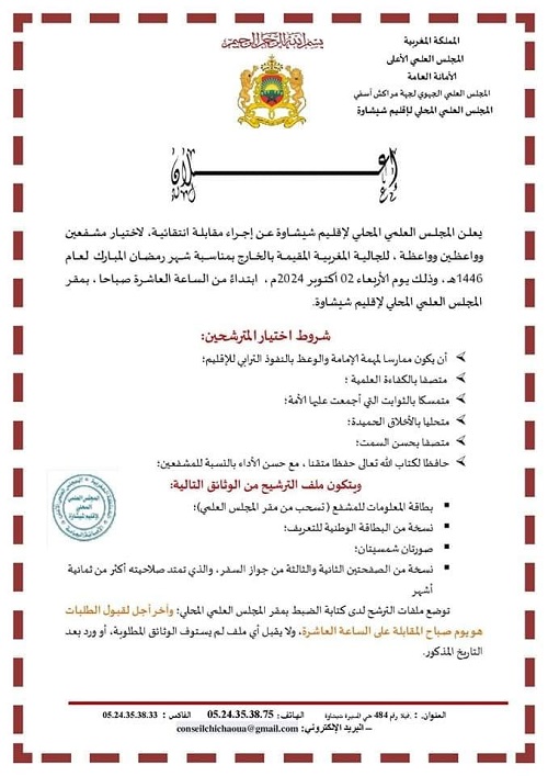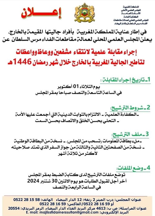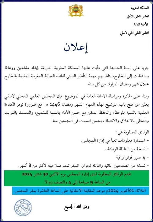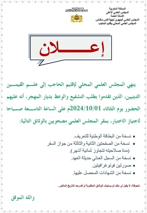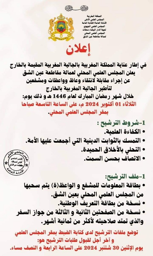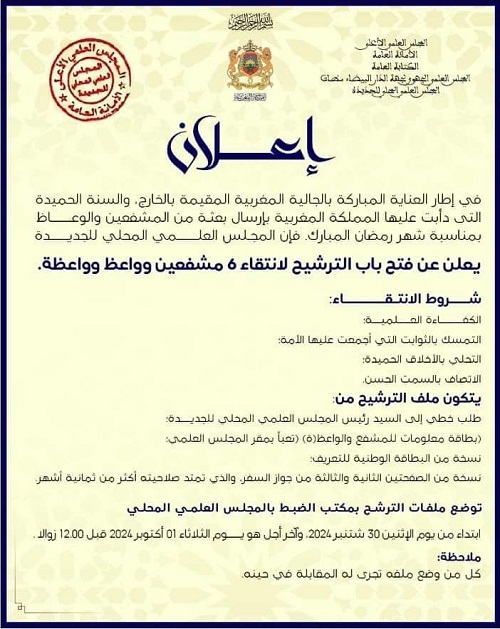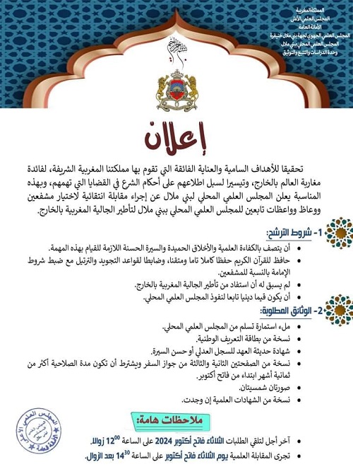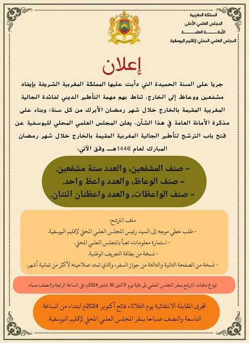 أعلنت العديد من المجالس العلمية المحلية بجل المدن المغربية عن انطلاق إجراء مقابلات الانتقاء لبعثة القيمين الدينيين للجالية لأجل التشفيع والوعظ في رمضان المبارك 1446هـ.