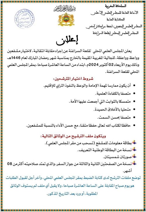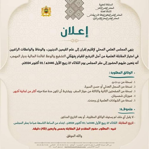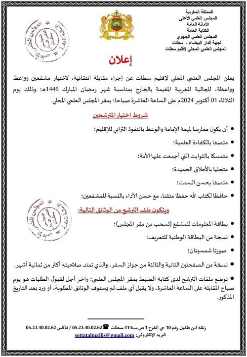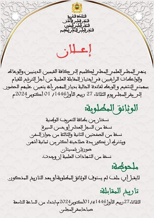 وهذا نموذج من إعلان المجلس العلمي المحلي بعمالة مقاطعات عين السبع الحي المحمدي بالدار البيضاء، يذكر تاريخ إجراء المقابلة وشروط اختيار المترشحين، والوثائق المطلوبة للترشيح.