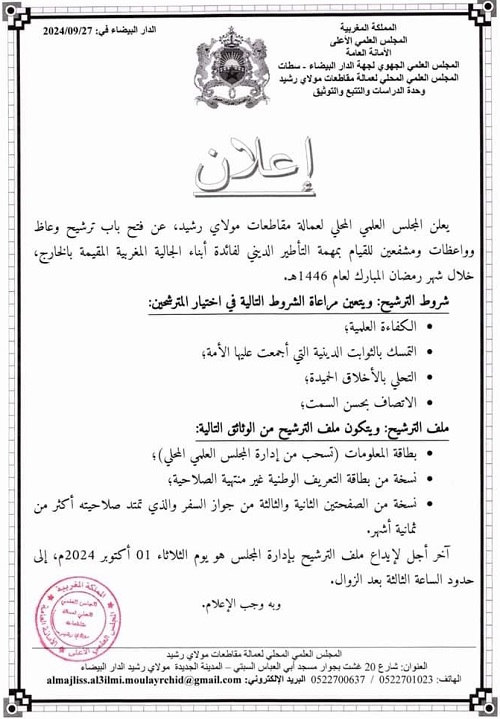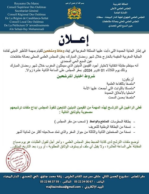 وهذا نص الإعلان “المجلس العلمي الجهوي لجهة الدار البيضاء-سطات المجلس العلمي المحلي بعمالة مقاطعات عين السبع الحي المحمدي.
