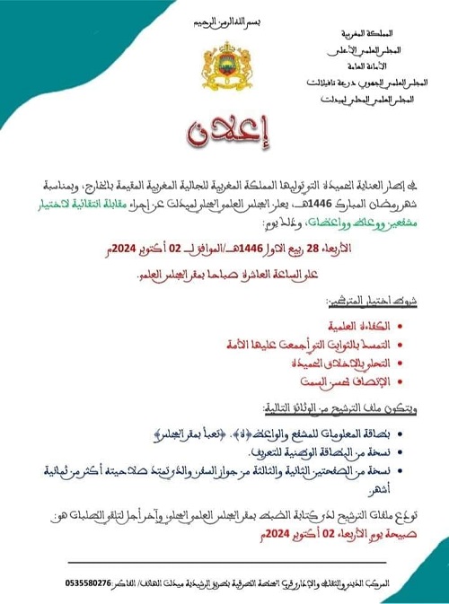 توضع ملفات الترشح لدى كتابة الضبط بمقر المجلس العلمي، وآخر أجل لقبول الطلبات هو يوم صباح المقابلة على الساعة العاشرة، ولا يقبل أي ملف لم يستوف الوثائق المطلوبة، أو رد بعد التاريخ المذكور”.