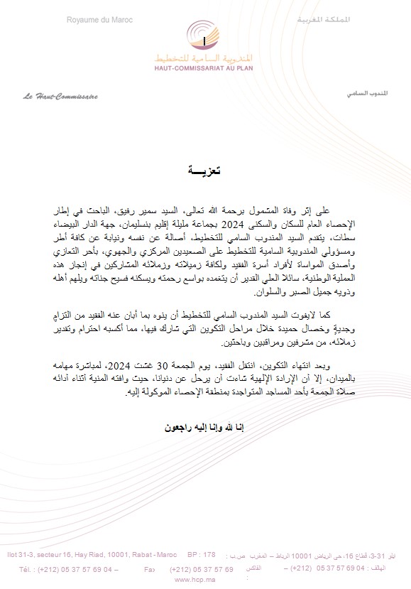 وبهذه المناسبة الأليمة تقدم المندوب السامي للتخطيط عبر منشور على الموقع الرسمي وصفحة المندوبية بالفايسبوك، بالنيابة عن كافة الأطر والمسؤولين في المندوبية على المستويين المركزي والجهوي، بأصدق تعازيه ومواساته لأسرة الفقيد وزملائه المشاركين في هذه العملية الوطنية.