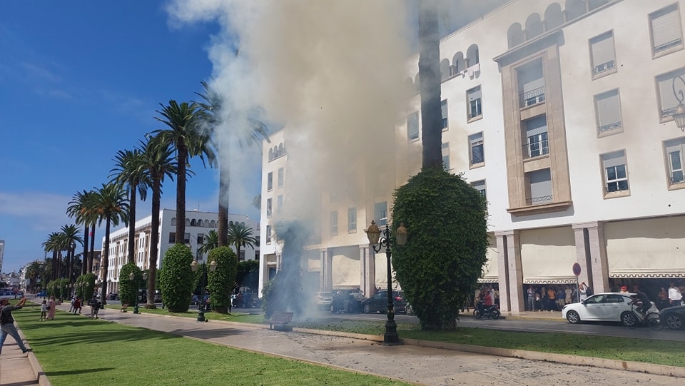 شب حريق بنخلة في شارع محمد الخامس أمام مبنى البرلمان بالرباط، زوال اليوم الثلاثاء.