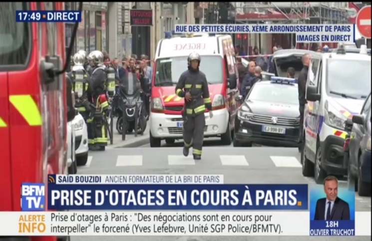 وبحسب قناة “بي -اف-م-تي -في” فإن الرجل الذي يتفاوض مع الشرطة حاليا أخبرهم أنه يحمل قنبلتين وقال إنه يريد التحدث مع السفارة الإيرانية بباريس. وحتى اللحظة تستبعد الشرطة فرضية العمل الإرهابي.