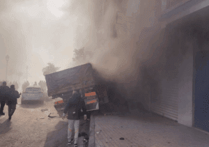 كما أسفر الاصطدام القوي عن اندلاع النيران في الشاحنة، ثم امتدت إلى وسط المقهى وإحدى المنازل المجاورة. وتسبب ذلك في محاصرة رواد المقهى، الذين تم إنقاذهم بعد تدخل بطولي من أحد المواطنين.