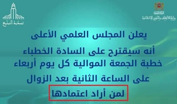 يذكر أن المجلس العلمي الأعلى إثر الضجة التي أثيرت بعد الإعلان عن إطلاق “خطة تسديد التبليغ” واعتماد الخطبة الموحدة يونيو الماضي كان أصدر قرارا أسبوعين بعد ذلك باختيارية الخطبة، وهو القرار الذي شوشت عليه بعض إجراءات وزارة الأوقاف، حيث اعتمدت بعض مندوبياتها ملء استمارات لمعرفة مدى التفاعل مع الخطبة التي يقترحها المجلس العلمي الأعلى كل أسبوع، وهذا ما أشار إليه الوزير في كلمته أمس واصفا ذلك بـ”التتبع الدقيق”.
