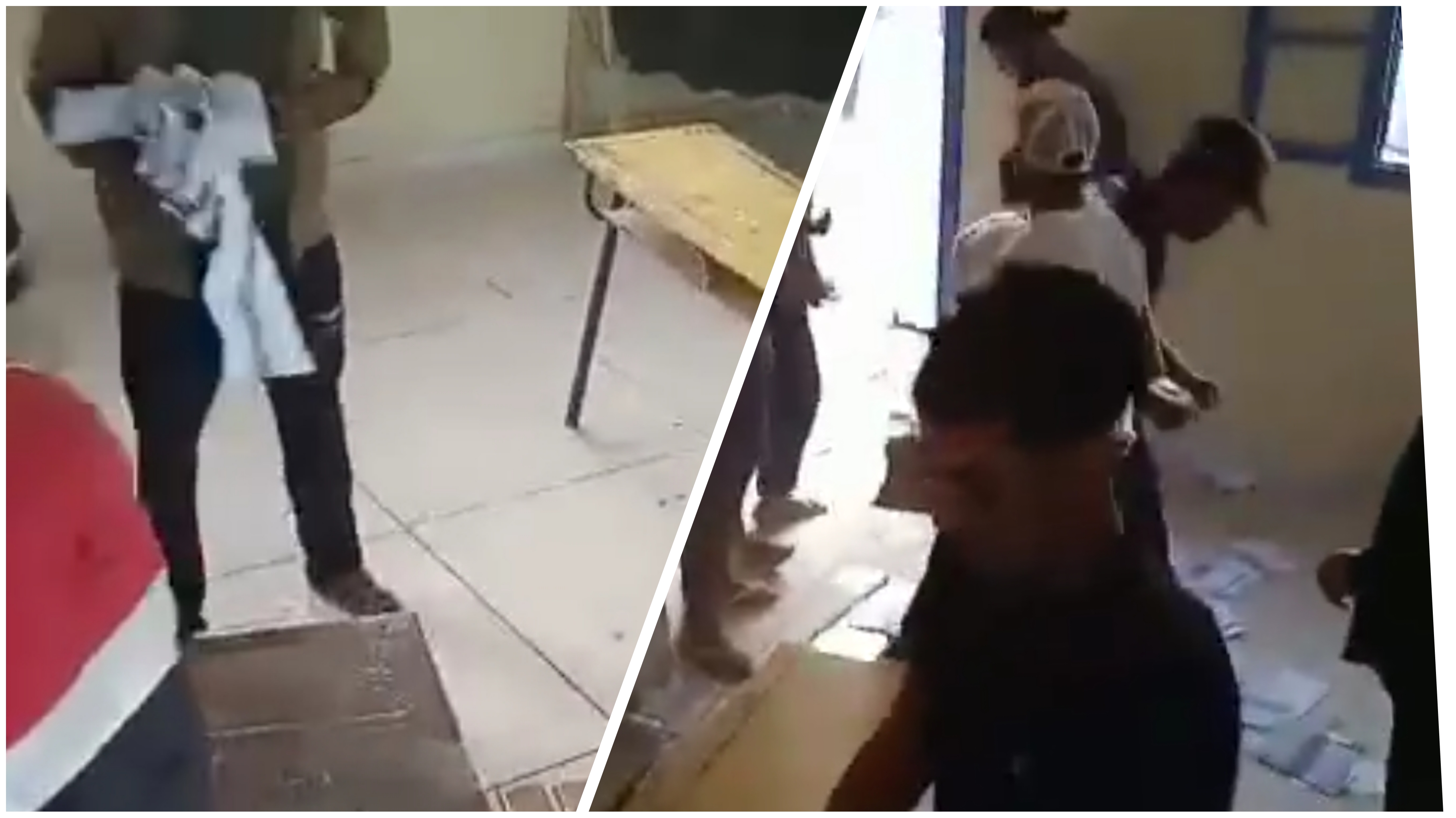 وأظهر الشريط حالة الفوضى التي أحدثها هؤلاء المقتحمين للمكتب، بعدما قطعوا أوراق التصويت وسطو عليها بسبب خلافات انتخابية بين أنصار المرشحين.