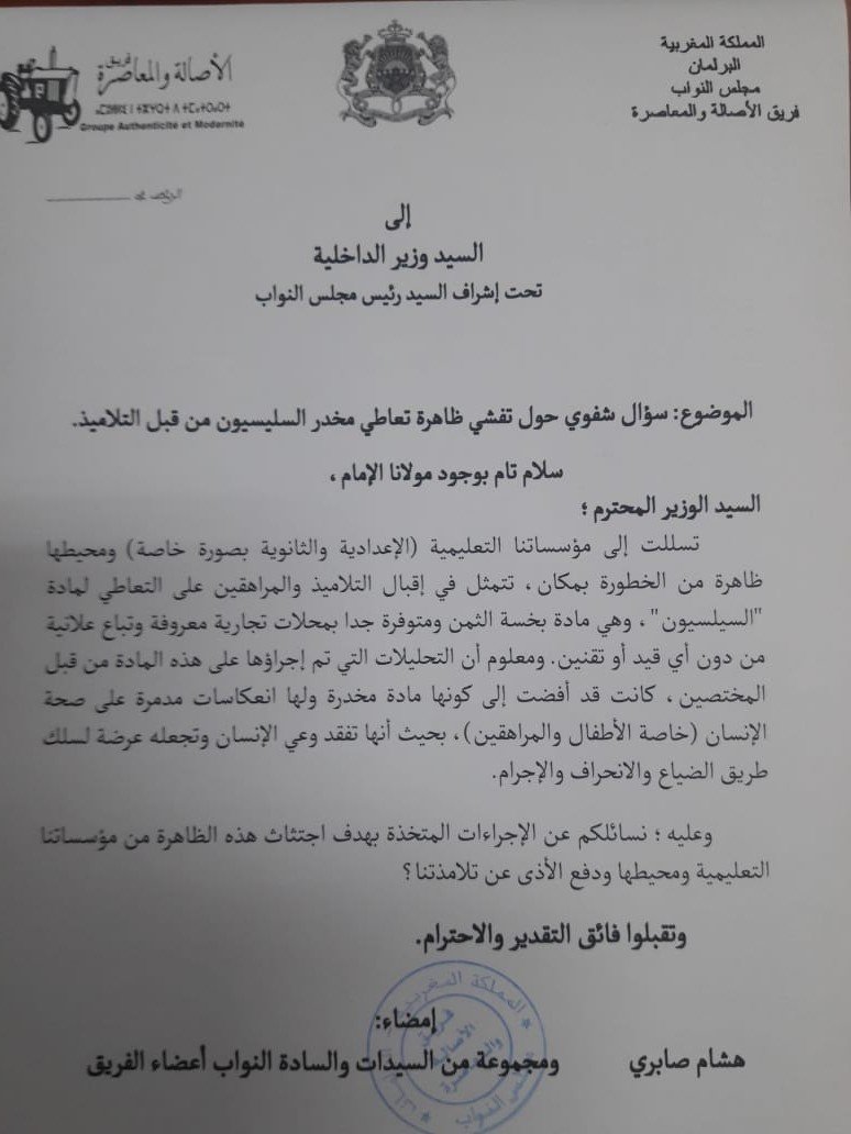 وقد تساءل البرلماني المذكور في سؤاله الذي وجهه لوزير الداخلية الفتيت عن الاجراءات المتخدة من أجل اجثتات الظاهرة من المؤسسات التعليمية ومحيطها ودفع الاذى عن التلاميذ؟، وقد وضح قبل طرح سؤاله أن هذه المادة “السليسيون” يباع بثمن بخس ومتوفر جدا بمحلات تجارية معروفة وتباع بعلانية من دون قد أو تقنين، بالإضافة إلى ما توصلت به التحليلات التي أجريت على هذه المادة التي تعتبر مادة مخدرة ولها انعكاسات مدمرة على صحة الإنسان، حيث أنها تفقد وعي الإنسان وتجعله عرضة لسلك طريق الضياع والانحراف والإجرام.
