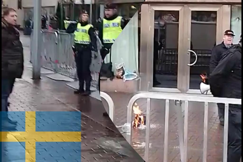 بالفيديو.. وسط حراسة أمنية متطرف يحرق المصحف ويسب الرسول محمدﷺ بالسويد!!
