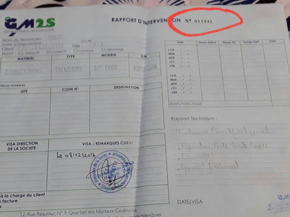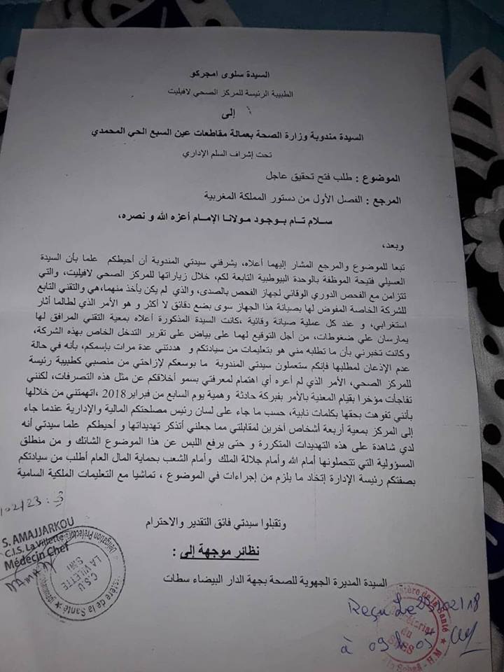 وحسب المراسلة والوثائق، فالطبيبة الرئيسة للمركز الصحي المذكور، رفضت وترفض التوقيع على بياض على تقرير التدخل الخاص لشركة، تقوم بالفحص الدوري والوقائي لجهاز الفحص بالصدى.