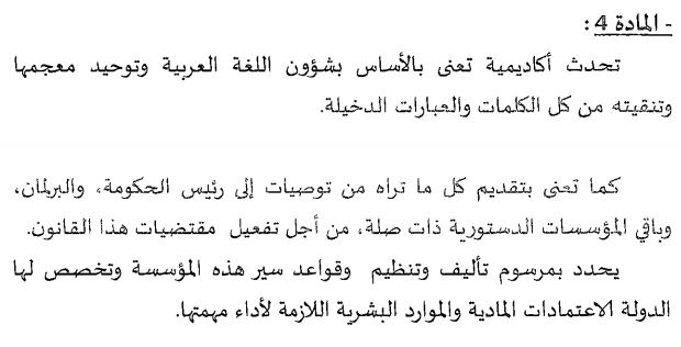 هذا وقد أحيل مقترح القانون على مجلس النواب سنة 2017، بحيث تضمن مواده حماية خاصة للغة العربية عبر مطالبة الحكومة بإنشاء “أكاديمية خاصة بحماية اللغة العربية”، موفرة لها كافة الموارد المالية والبشرية.