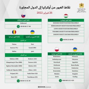 وتبين الجداول، أسفله، نقاط العبور من أوكرانيا إلى الدول المجاورة، كما حددتها وزارة الشؤون الخارجية والتعاون الإفريقي والمغاربة المقيمين بالخارج.