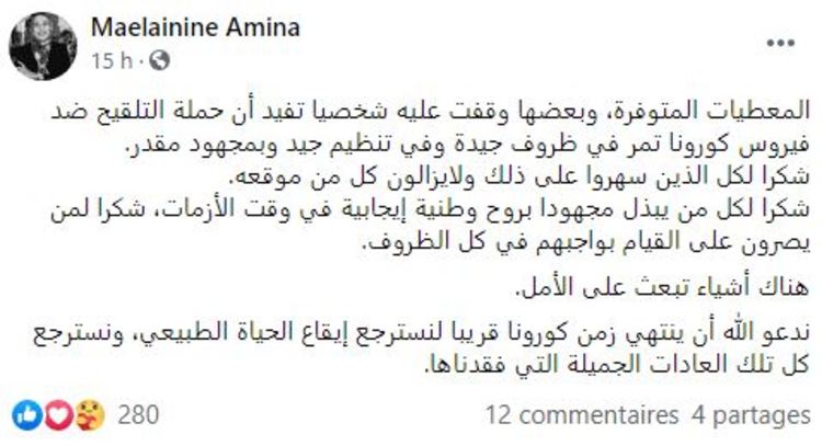 قالت أمينة ماء العينين، النائبة البرلمانية عن حزب العدالة والتنمية، أنه من خلال المعطيات المتوفرة، والتي وقفت النائبة على بعضها شخصيا، تفيد أن حملة التلقيح الوطنية ضد فيروس كورونا تمر في ظروف جيدة وفي تنظيم جيد وبمجهود مقدر.
