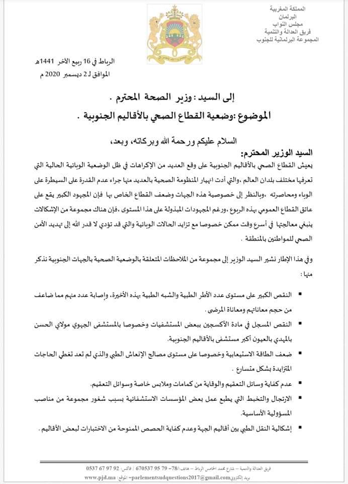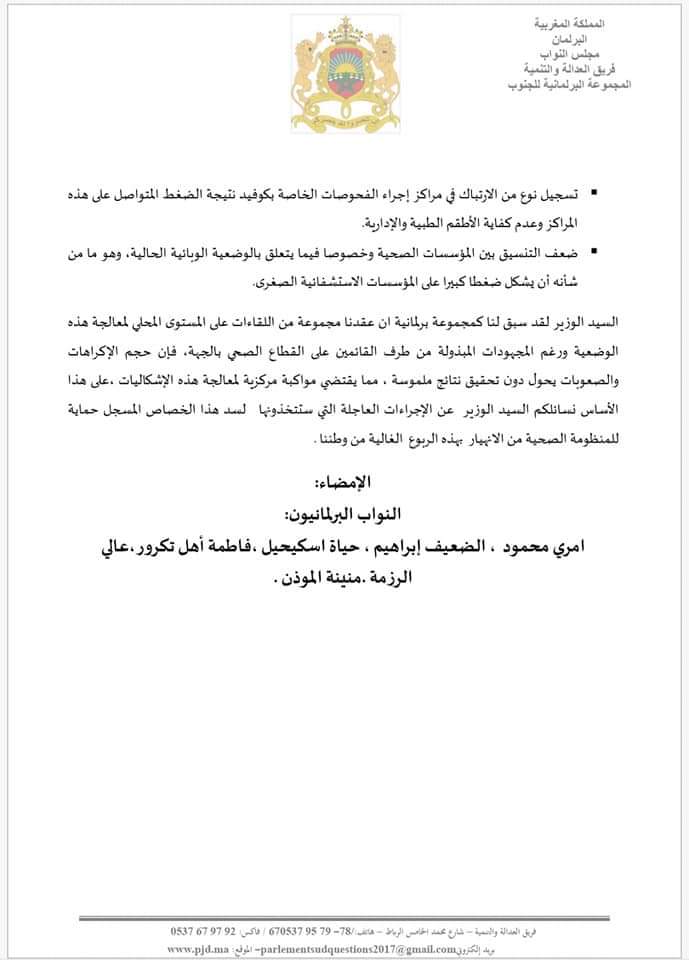 ونبه نواب البيجيدي، إلى إشكالية النقل الطبي وعدم كفاية الحصص الممنوحة من الاختبارات لبعض الأقاليم، محذرين من الارتباك في مراكز إجراء الفحوصات الخاصة بكوفيد نتيجة الضغط المتواصل عليها.