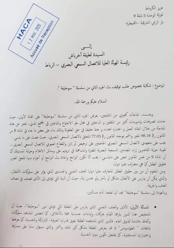 تجدر الإشارة إلى أن رئيس جمعية منتدى الطفولة، سبق وراسل هو الآخر الهيأة العليا للاتصال السمعي البصري لإيقاف بث سلسلة “سوحليفة”، كما حذرت طبيبة أطفال المشاهدين من مضامينها.