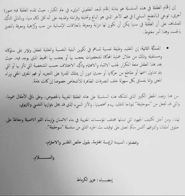 وأضافت “نرصد الخطر الذي تشكله هذه السلسلة على هاته الطفلة المغربية بالخصوص، وعلى باقي الأطفال، تجعلها نموذجا للتقليد يهدم شخصيتها يخل بتوازنها النفسي والتربوي”.