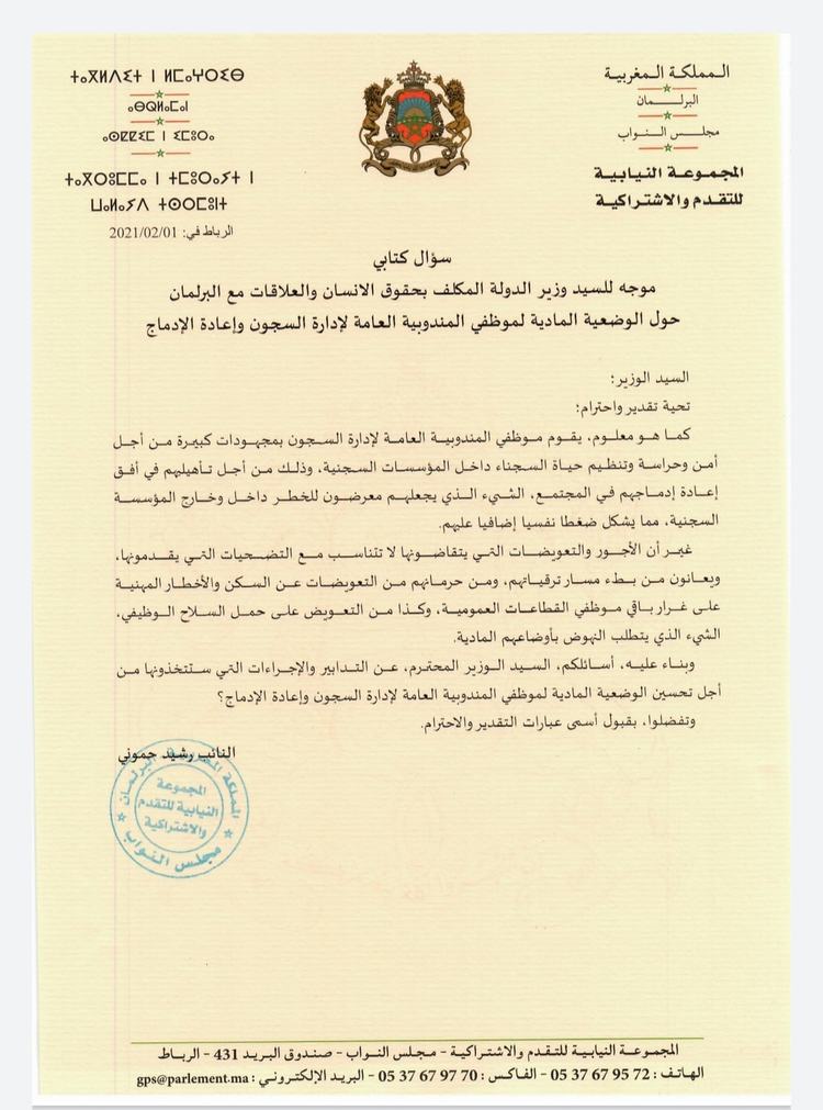 وساءل المصدر ذاته، الوزير الرميد، عن التدابير والاجراءات التي ستتخذها الوزارة من أجل تحسين الوضعية المادية لموظفي مندوبية السجون.
