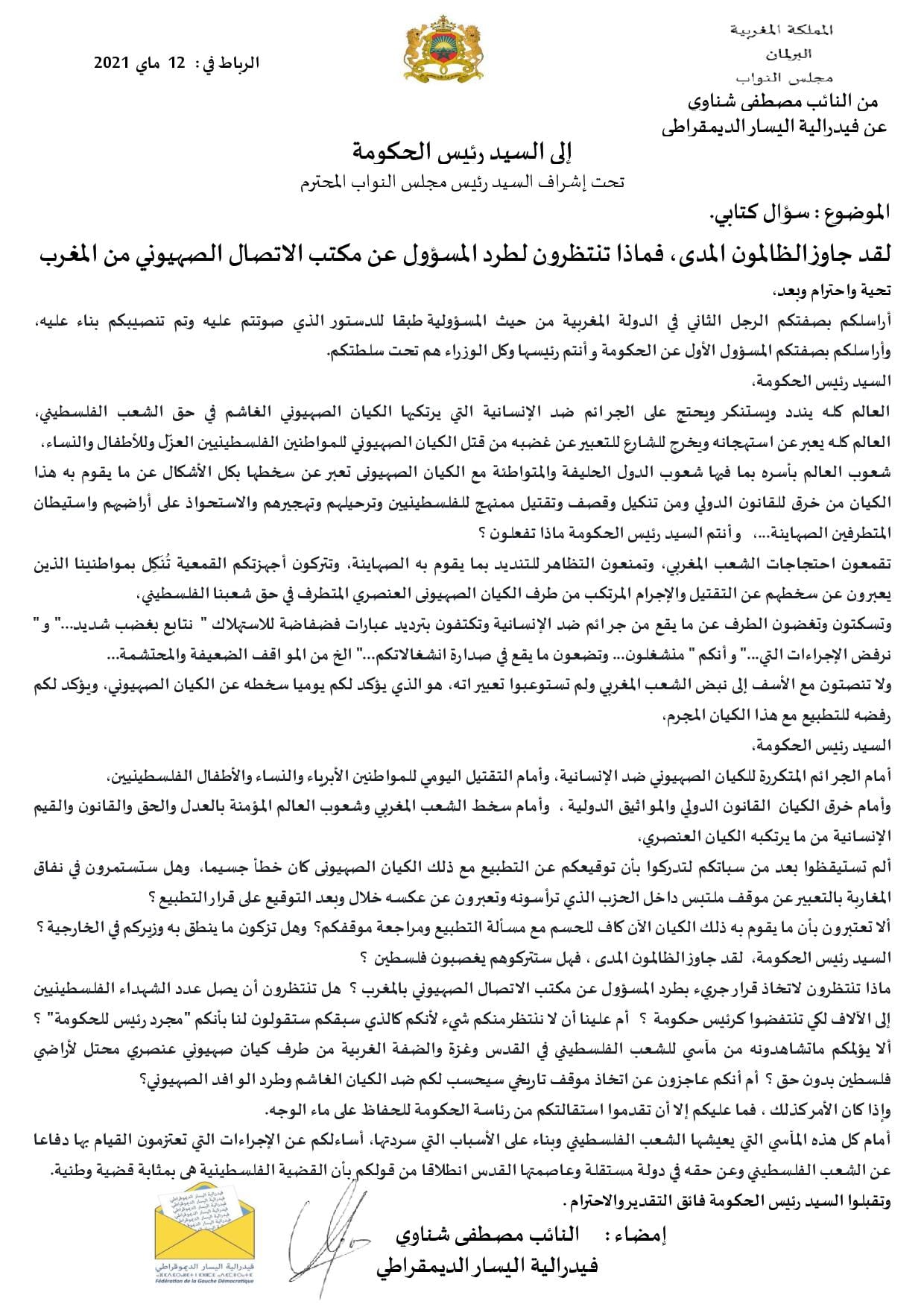 وتقبلوا السيد رئيس الحكومة فائق التقدير والاحترام . إمضاء : النائب مصطفى شناوي فيدرالية اليسار الديمقراطي.