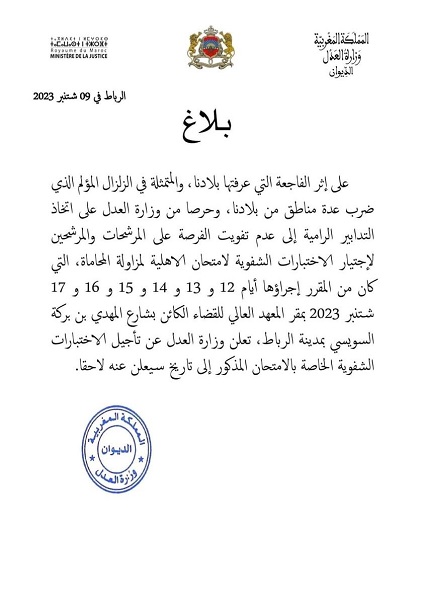 بسبب الزلزال.. وزارة العدل تعلن عن تأجيل الاختبارات الشفوية لامتحان المحاماة (وثيقة)