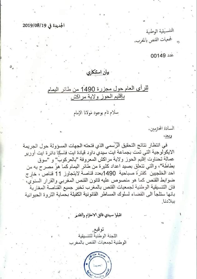 “في انتظار نتائج التحقيق الرسمي الذي فتحته الجهات المسؤولة حول الجريمة الايكولوجية التي تمت بجماعة آيت سيدي داود قيادة آيت فاسكا دائرة ايت أورير عمالة تاحناوت إقليم الحوز ولاية مراكش المعروفة “بالعركوب” و”سوق بطاطة”، والتي تتعلق بصيد أعداد كثيرة من طائر اليمام كما هو مصرح به من أحد الخلجيين كفترة صباحية 1490 بعدد قناصة لايتجاوز 11 قناصا، خارج ضوابط القنص كما هو منصوص عليه بقانون القنص المغربي والقرار السنوي، فإن التنسيقية الوطنية لجمعيات القنص بالمغرب تخبر جميع القناصة المغاربة بانها ستلجأ إلى القضاء لسلوك المساطر القانونية الكفيلة بحماية الثروة الحيوانية ببلادنا”.