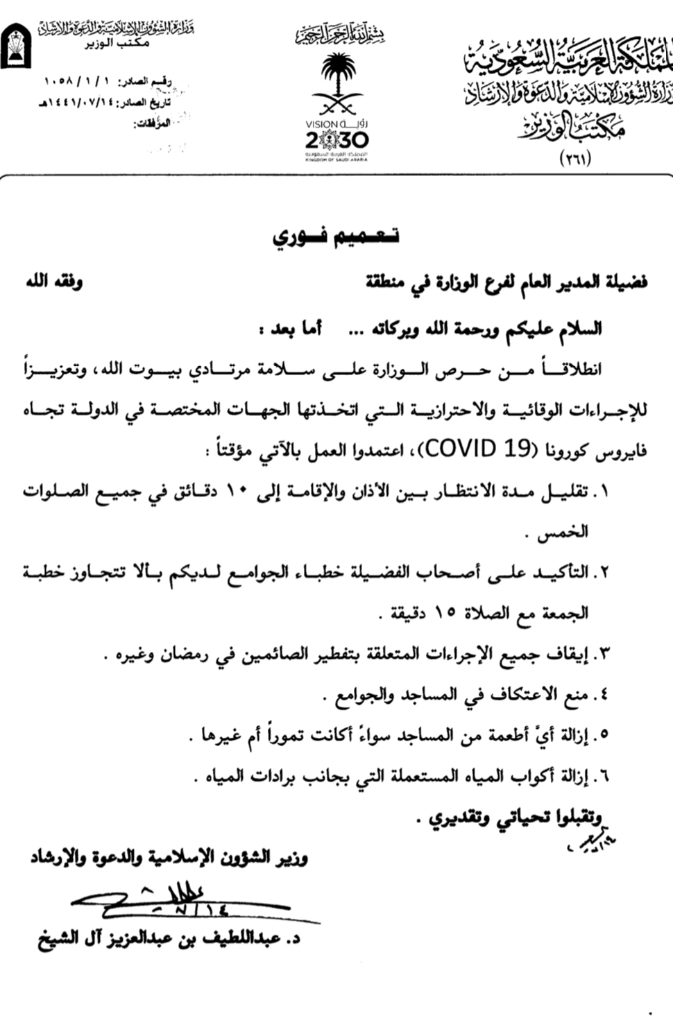 أصدر وزير الشؤون الإسلامية والدعوة والإرشاد في السعودية، عبد اللطيف بن عبد العزيز آل الشيخ مجموعة قرارات احترازية لمواجهة فيروس كورونا (COVID19).