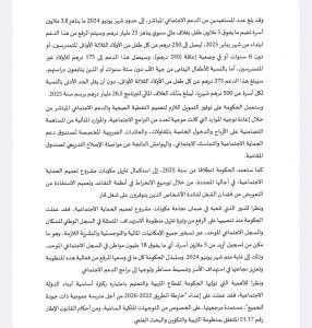 وأشار المنشور إلى أن عدد المستفيدين من الدعم الاجتماعي المباشر، قد بلغ إلى حدود شهر يونيو 2024 ما يناهز 3.8 ملايين أسرة تضم ما يفوق 5 ملايين طفل بغلاف مالي سنوي يناهز 25 مليار درهم.