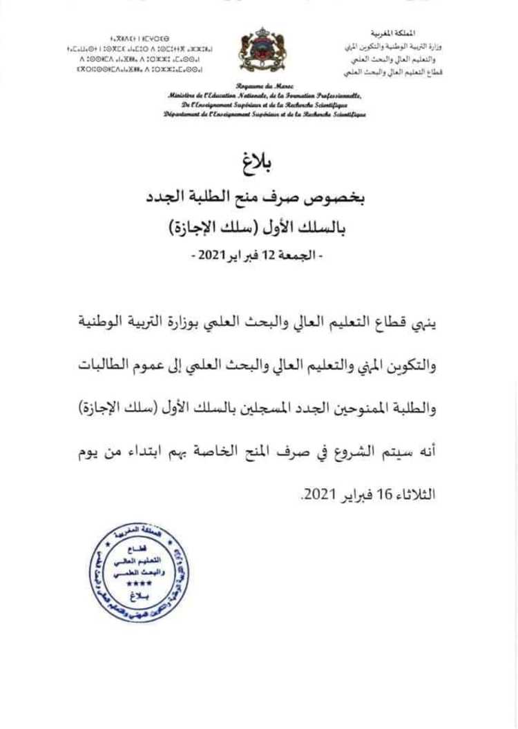 أفاد قطاع التعليم العالي والبحث العلمي بوزارة التربية الوطنية والتكوين المهني والتعليم العالي والبحث العلمي، أن يوم الثلاثاء القادم 16 فبراير الجاري، هو موعد صرف المنحة للطلبة الجدد بالنسبة للموسم الجامعي 2020/2021.