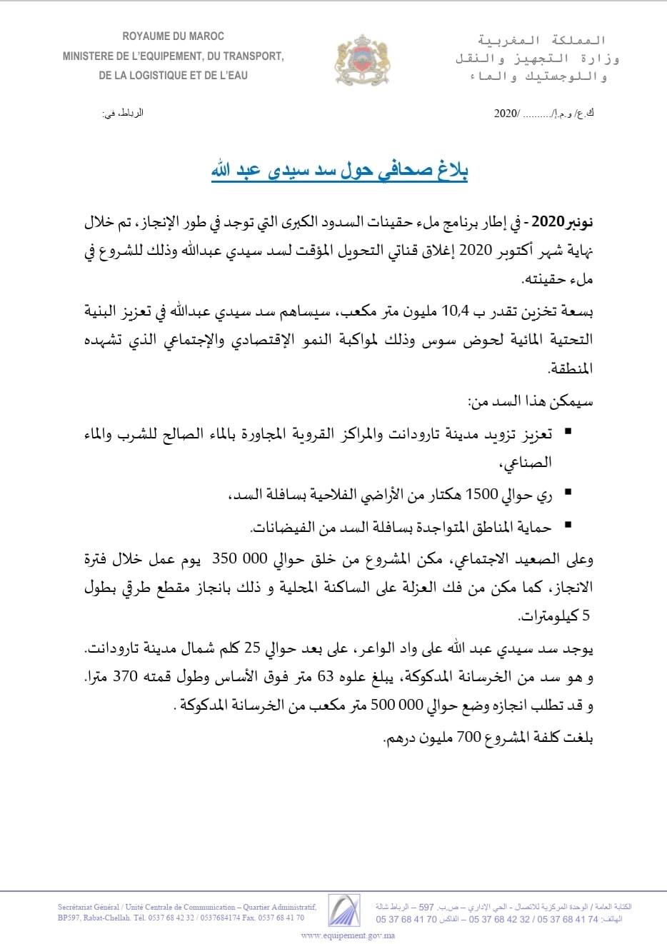 وأضاف البلاغ، ان السد سيعزز تزويد مدينة تارودانت والمراكز القروية المجاورة بالماء الصالح للشرب.