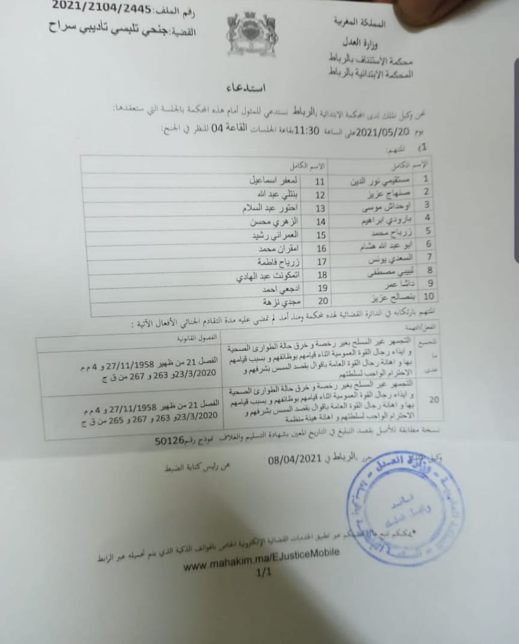 وتقرر مواجهة الأساتذة المتعاقدين، الذين تم اعتقالهم أثناء تظاهرهم، أول أمس، وفق ما يظهره الاستدعاء، بتهم التجمهر غير المسلح بغير رخصة، وخرق حالة الطوارئ الصحية، وإيذاء رجال القوة العمومية أثناء قيامهم بوظائفهم وبسبب قيامهم بها، وإهانة رجال القوة العامة بأقوال قصد المس بشرفهم والاحترام الواجب لسلطتهم، وإهانة هيأة منظمة، وحددت المحكمة الابتدائية في الرباط، يوم 20 ماي المقبل، موعدا لأولى جلسات محاكمتهم.