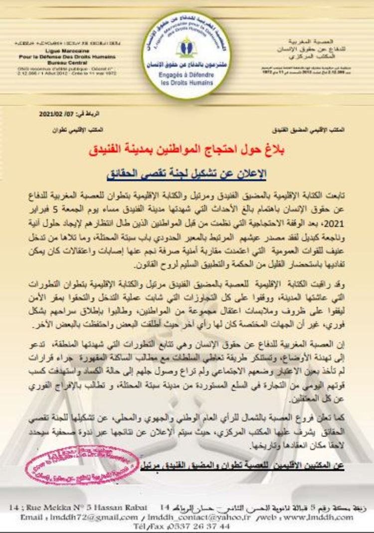 قالت العصبة المغربية للدفاع عن حقوق الإنسان، إنها تابعت باهتمام بالغ الأحداث التي شهدتها مدينة الفنيدق، مساء يوم الجمعة 5 فبراير الجاري، بعد الوقفة الاحتجاجية التي نظمت من قبل المواطنين، الذين طال انتظارهم لإيجاد حلول آنية وناجعة كبديل لفقد مصدر عيشهم المرتبط بالمعبر الحدودي باب سبتة، وما تلاها من تدخل عنيف للقوات العمومية التي اعتمدت مقاربة أمنية صرفة نجم عنها إصابات واعتقالات كان يمكن تفاديها باستحضار القليل من الحكمة والتطبيق السليم لروح القانون.