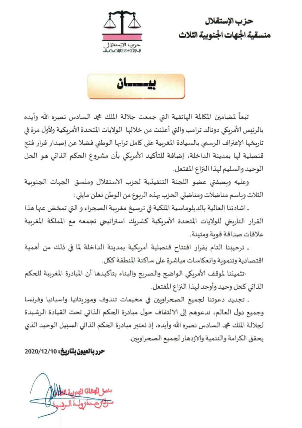 وأضاف ولد الرشيد في بلاغ له كمنسق جهوي لحزب الاستقلال بالجهات الثلاث للصحراء المغربية، أن الاعتراف الأمريكي بمغربية الصحراء تتويج لمسار الاعتراف بمبادرة الحكم الذاتي كحل أممي واقعي ومنصف.