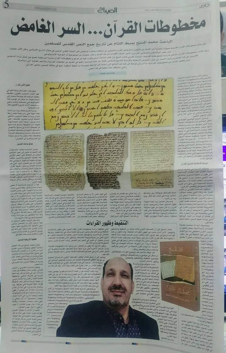 نشرت يومية الصباح في عددها ليوم الثلاثاء 22 شتنبر 2020 مقالا لمحمد المسيّح بعنوان “مخطوطات القرآن … السر الغامض”، مصدرة له بعبارة “الباحث محمد المسيّح يميط اللثام عن تاريخ جمع النص المقدس للمسلمين”! وكأن الإسلام الذي تتحدث عنه لا يعنيها في شيء، وليس الدين الرسمي للدولة والشعب المغربي..