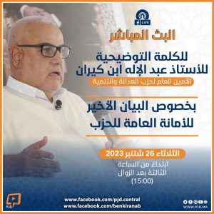 وذلك اليوم الثلاثاء على الساعة الثالثة بعد الزوال، على صفحتي حزب العدالة والتنمية وعبد الإله بنكيران بفيسبوك.