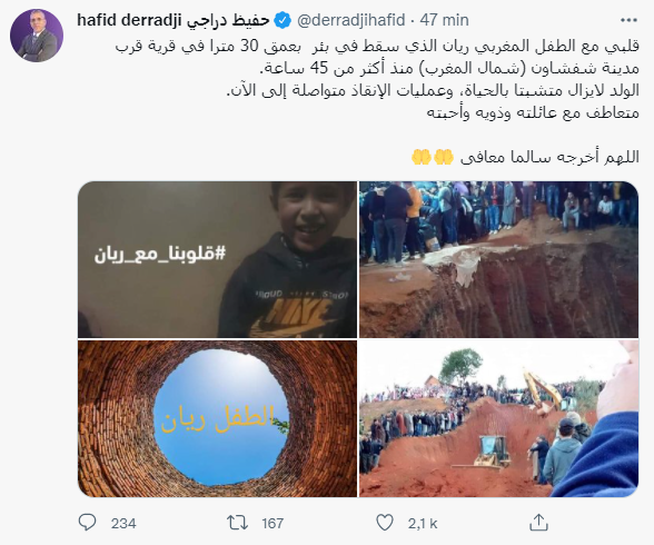 ونشر دراجي تغريدة على صفحته الرسمية على “تويتر” قال فيها “قلبي مع الطفل المغربي ريان الذي سقط في بئر بعمق 30 مترا في قرية قرب مدينة شفشاون (شمال المغرب) منذ أكثر من 45 ساعة. الولد ل ايزال متشبتا بالحياة، وعمليات الإنقاذ متواصلة إلى الآن… متعاطف مع عائلته وذويه وأحبته”.