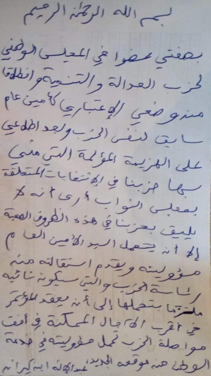 وأضاف بنكيران في منشور له مكتوب بخط اليد، أن العثماني بعد استقالته يكون نائبه ملزما بتحمل مسؤولية رئاسة الحزب إلى ان يعقد المؤتمر الوطني في “أقرب الآجال” الممكنة.