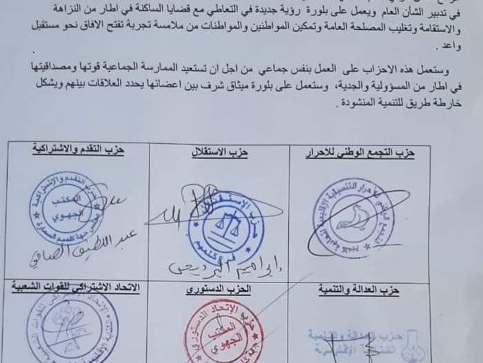 وحسب وثيقة التحالف وقع على هذا الاتفاق كل من حزب التقدم والاشتراكية، وحزب التجمع الوطني للأحرار، وحزب الاستقلال، وحزب العدالة والتنمية، والاتحاد الدستوري، والاتحاد الاشتراكي للقوات الشعبية، والحزب المغربي الحر، وحزب الديموقراطيين الجدد، وحزب الوحدة والديموقراطية،