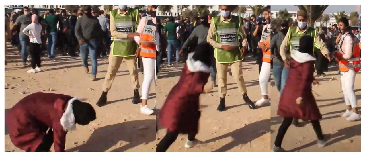 وفي هذا السياق، فقد تم رصد العديد من التسجيلات والمقاطع المصورة الموثقة، التي تم بترها من سياقها العام، والتي تظهر فيها نفس الشرطية المنسوب لها تلك التجاوزات المفترضة، وهي تخضع للدفع والتهديد بالرشق بالحجارة من طرف إحدى المشاركات في هذا التجمهر غير المصرح به للسلطات العامة.
