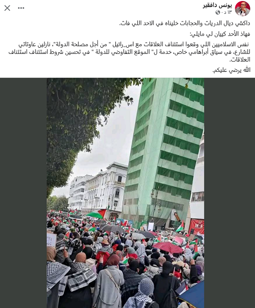 “داكشي ديال الدريات والحجابات خليناه في الاحد اللي فات. فهاذ الأحد كييان لي مايلي: نفس الاسلاميين اللي وقعوا استئناف العلاقات مع اس_رائيل ” من أجل مصلحة الدولة”، نازلين عاوتاتي للشارع، في سياق أبراهامي خاص، خدمة ل” الموقع التفاوضي للدولة ” في تحسين شروط استئناف استئناف العلاقات. الله يرضي عليكم”.